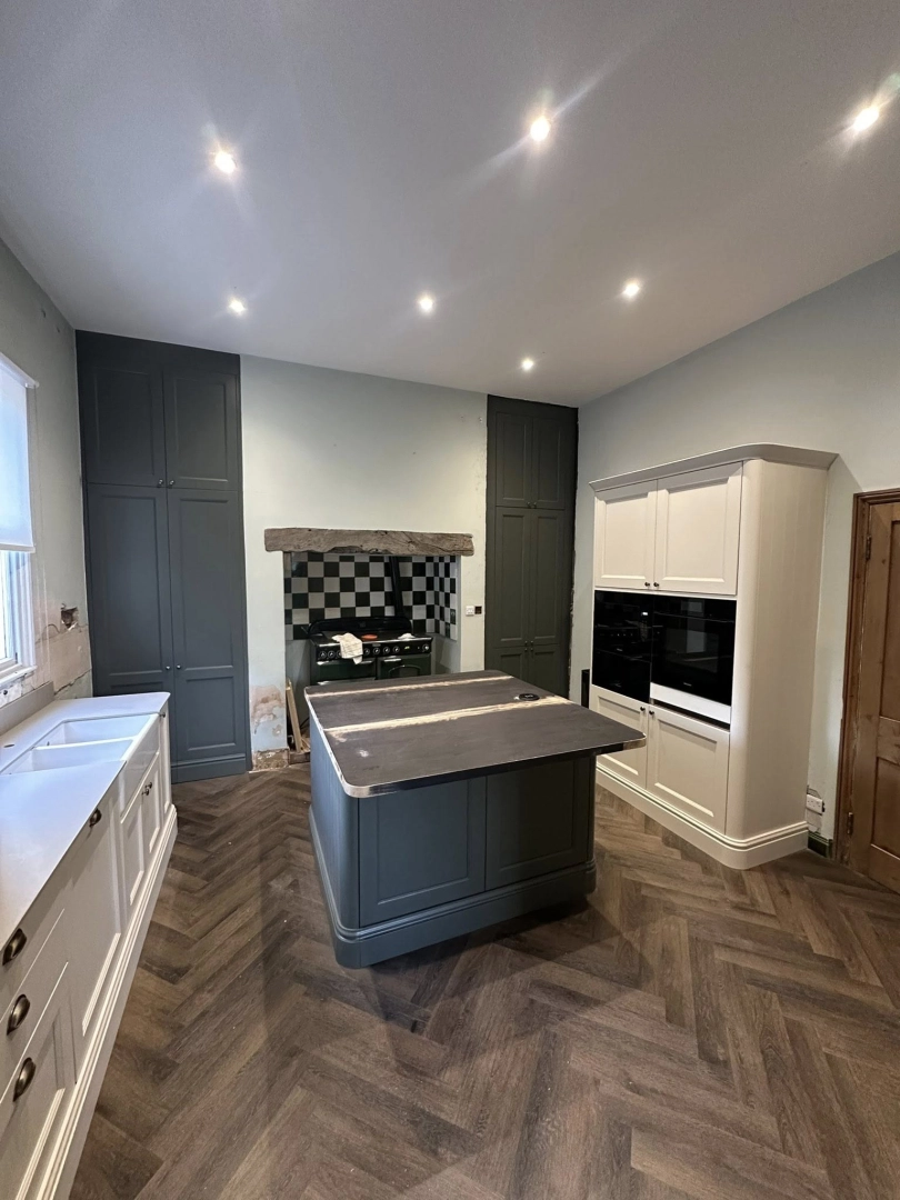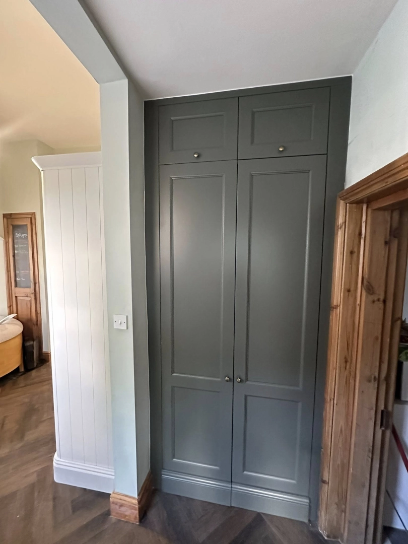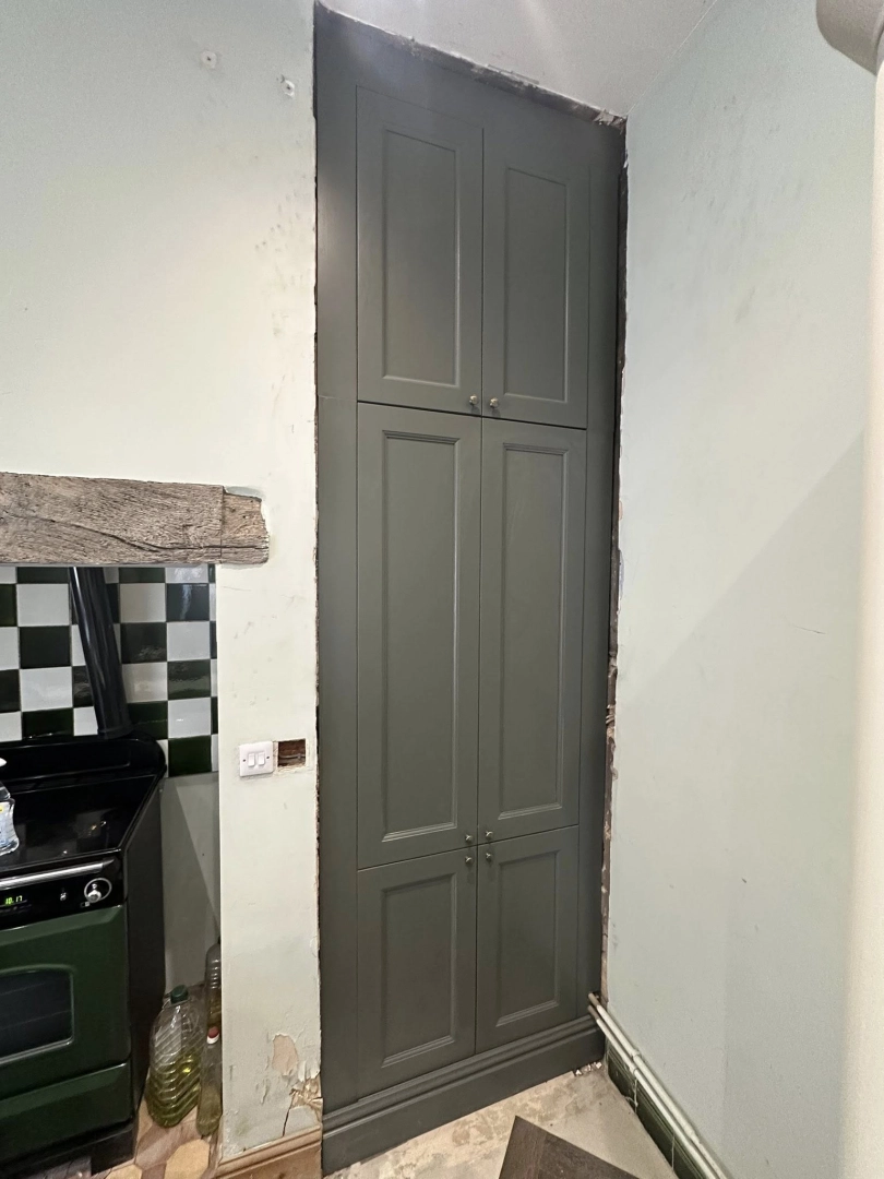 Custom-made alcove units installed in a new kitchen in Armitage, Rugeley, featuring ash green doors ...