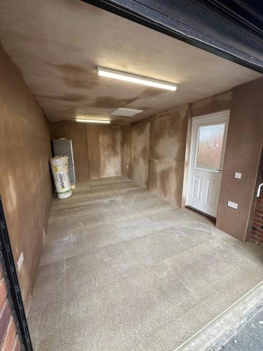 Garage in Lichfield converted into a home gym with roof insulation, loft hatch, plasterboard finish,...